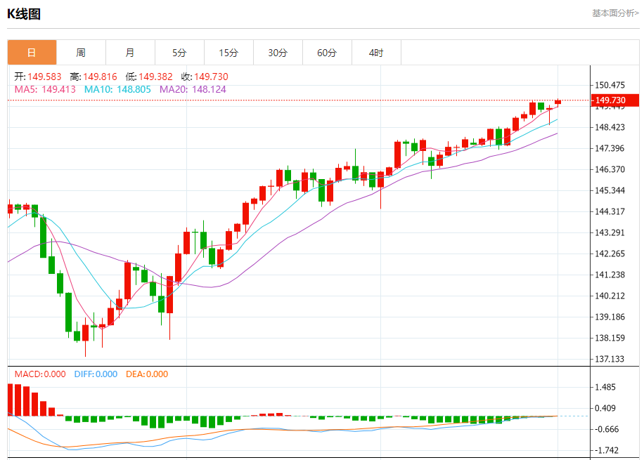 周一盘中,美元/日元报149.750,涨幅0.26%。