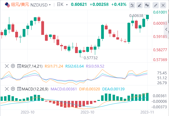 11月21日,周二亚市早盘,纽元/美元对连续第三个交易日吸引了一些后续买入,并触及8月11日以来的最高水平,约为0.6060。