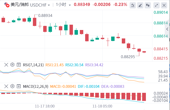 11月20日,周一欧市盘前,美元/瑞郎继续下行,交投在0.8849附近。由于市场认为美国劳动力市场有降温迹象,美元/瑞郎面临下行压力。这表明美联储(Fed)可能已经结束了加息周期,导致美元上周疲弱。 |