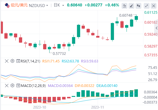 纽元/美元扩大涨势至三个月高点附近,周二欧盘交投与0.6050附近。美元的抛售压力持续,因为市场对联准会结束升息周期的共识增强。市场人气目前倾向认为联准会可能在2024年3月降息。 14天RSI位於50上方,显示纽元/美元人气看涨。这可能促使多头迈向0.6100附近的心理阻力位。 此外,MACD线位於中线发生,在讯号线上方背离,表示市场人气看涨。 下跌方面,23.6%回档位0.6004可能为关键支撑水平,然後为9日EMA均线0.5988。若果断跌破後者,可能为汇价测试38.2%回档位0.5960铺路,重要水准在0.5950。 |