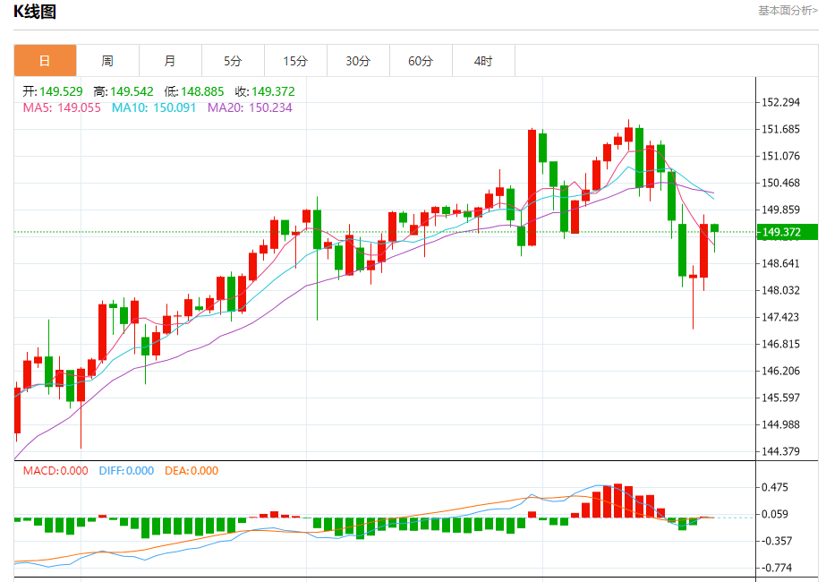 周四盘中,美元/日元报149.386,跌幅0.10%。