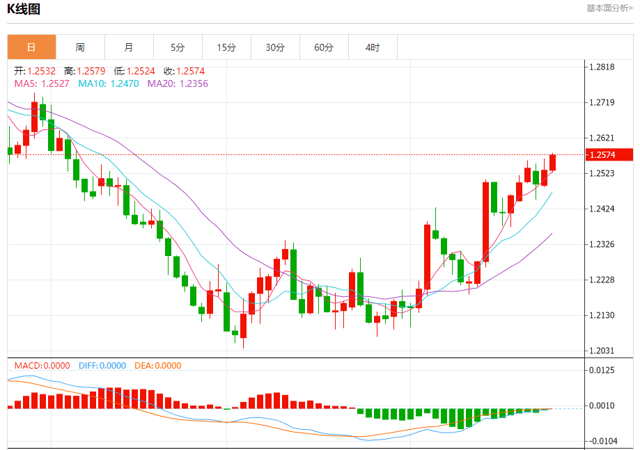 周五盘中,英镑/美元报1.2575,涨幅0.34%。