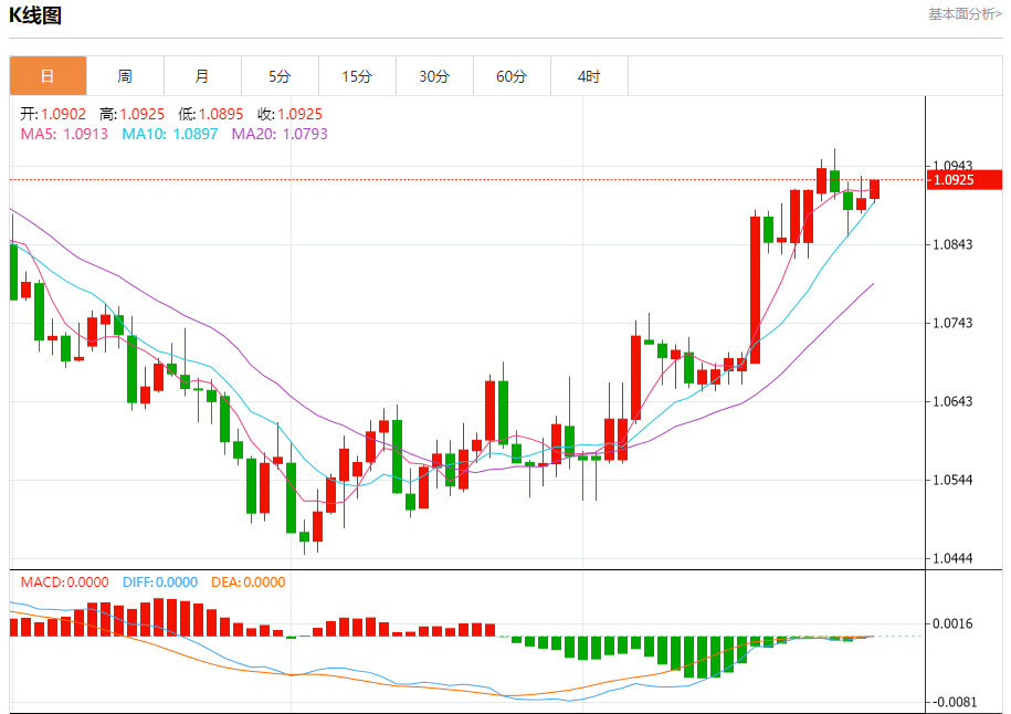 周五盘中,欧元/美元报1.0924,涨幅0.20%。