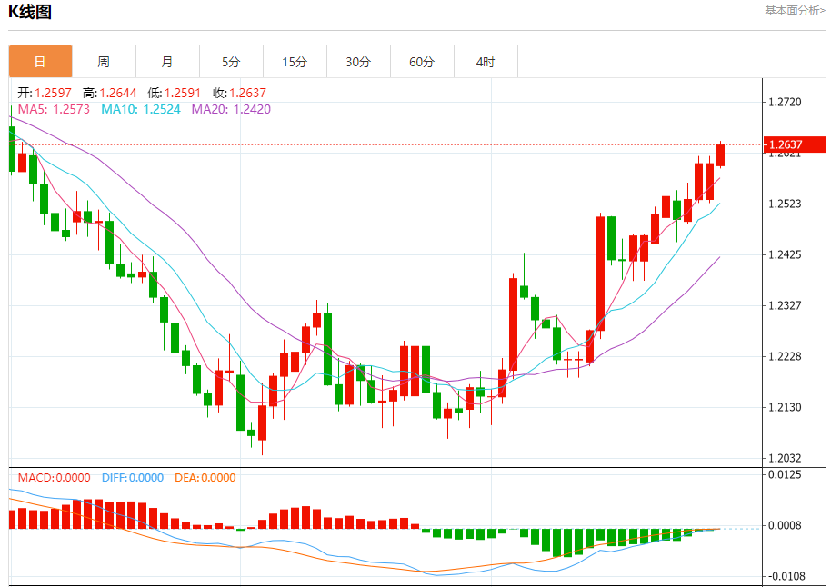 周一盘中,英镑/美元报1.2638,涨幅0.28%。