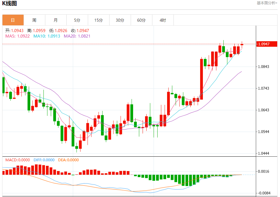 周一盘中,欧元/美元报1.0948,涨幅0.10%。