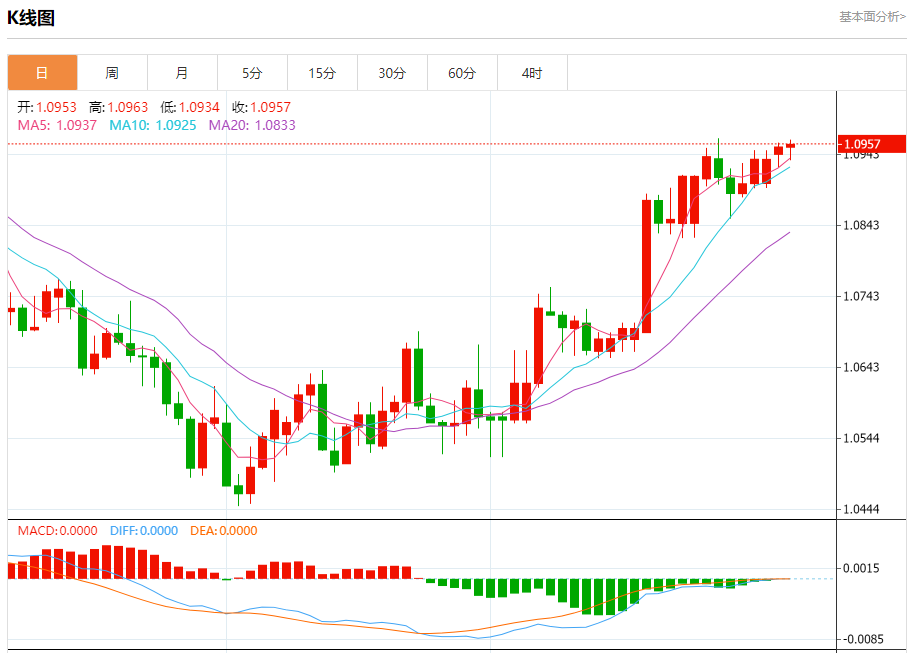 周二盘中,欧元/美元报1.0957,涨幅0.03%。