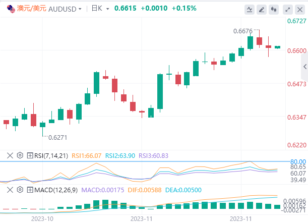 12月1日,周五亚市早盘,澳元/美元保持在0.6600心理关口以上。然而,美元的反弹可能会在短期内限制这对货币的上行。与此同时,美元指数飙升至103.50,而美国国债收益率小幅上升,10年期国债收益率为4.328%。澳元/美元目前在0.6605附近交易,当日下跌0.03%。 |