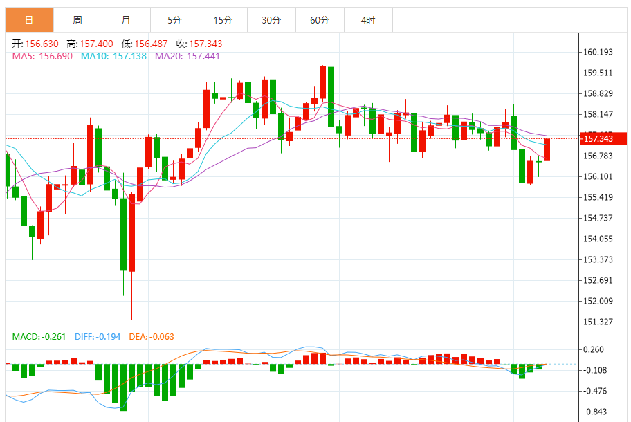 周五,欧元/日元上涨0.49%至157.375附近。