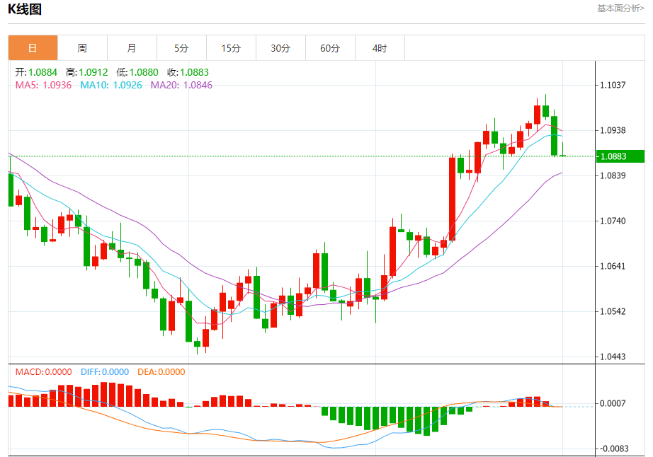 周五盘中,欧元/美元报1.0883,跌幅0.02%。