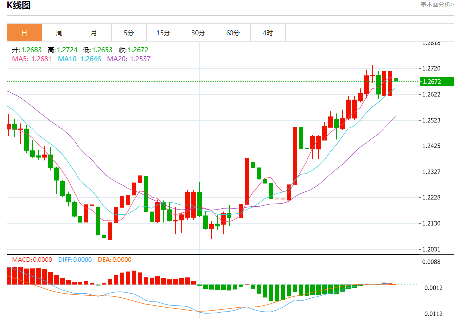 周一盘中,英镑/美元报1.2675,跌幅0.28%。