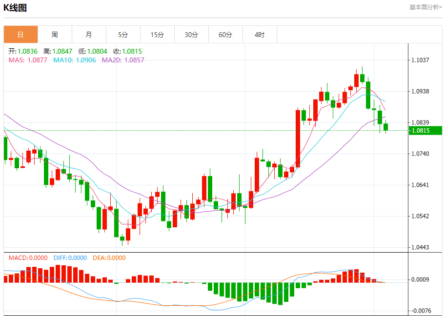 周二盘中,欧元/美元报1.0816,跌幅0.19%。