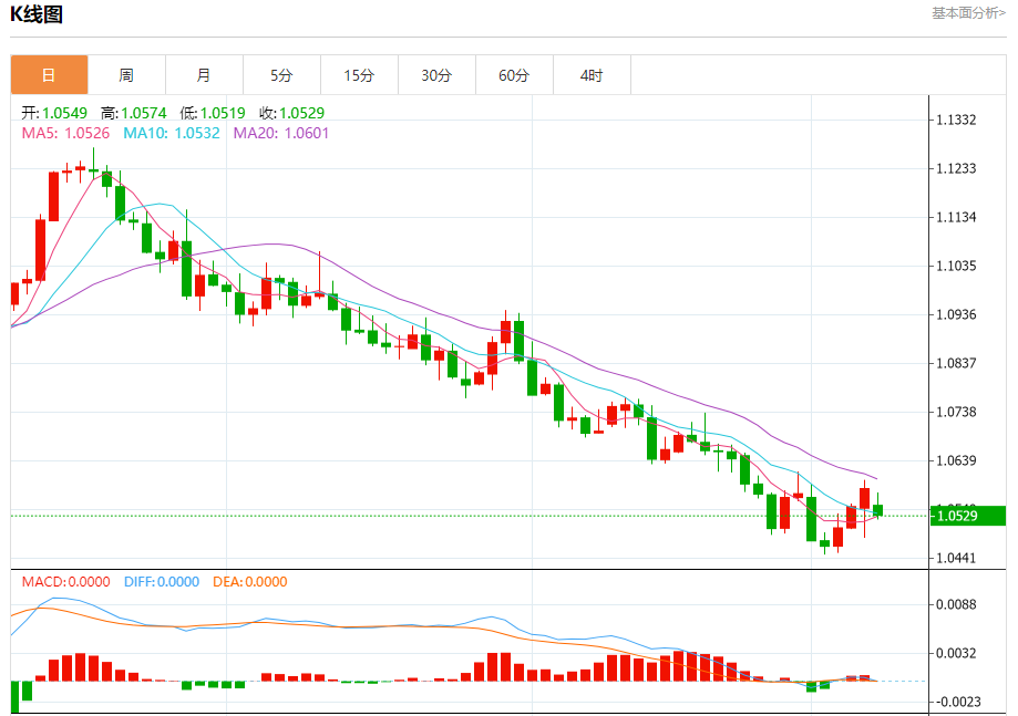 周一盘中,欧元/美元报1.0530,跌幅0.51%。