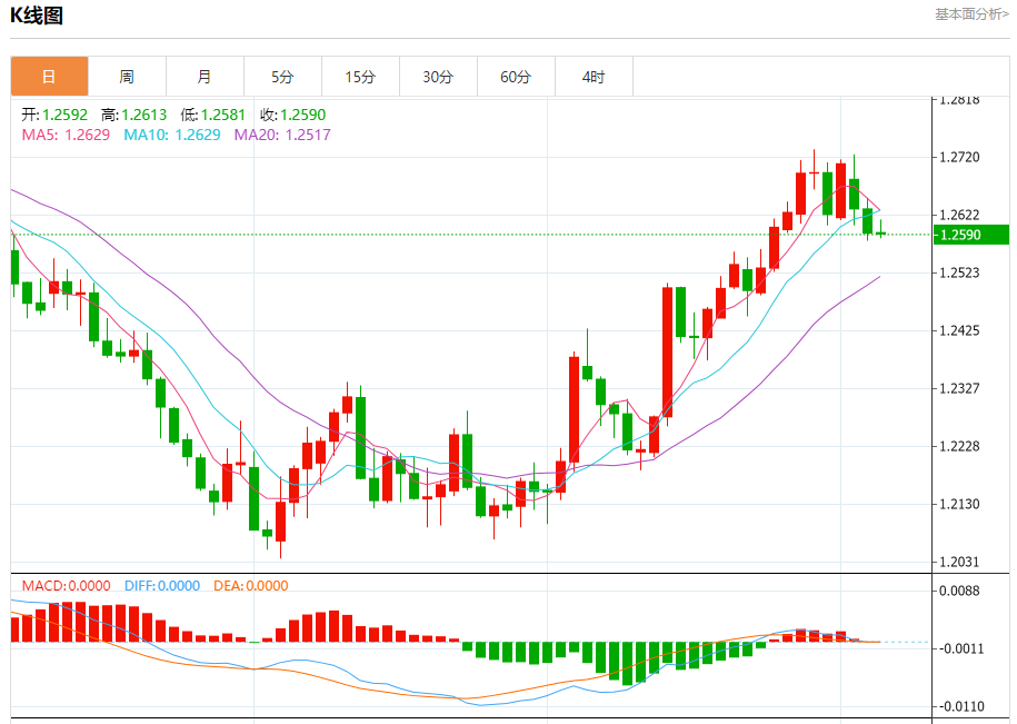 周三盘中,英镑/美元报1.2590,跌幅0.01%。