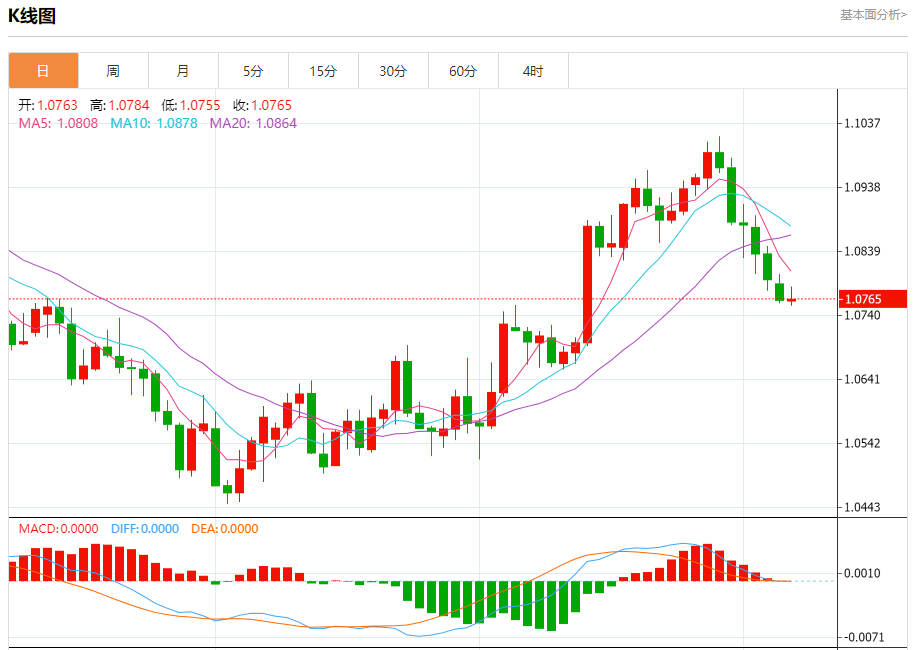 周四盘中,欧元/美元报1.0766,涨幅0.01%。