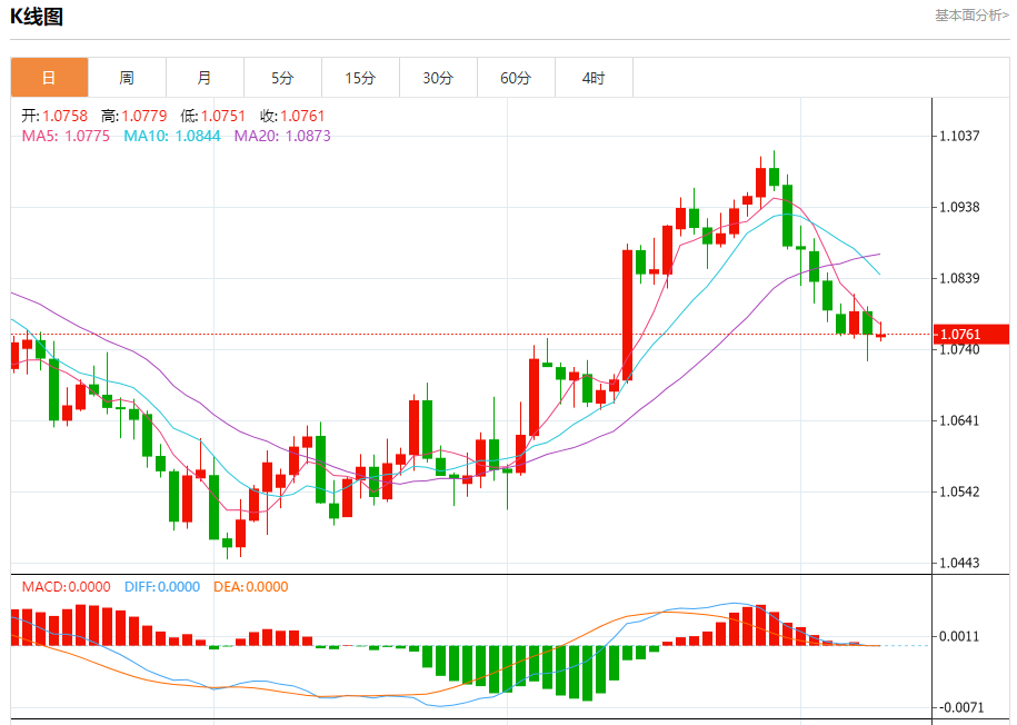 周一盘中,欧元/美元报1.0762,涨幅0.00%。