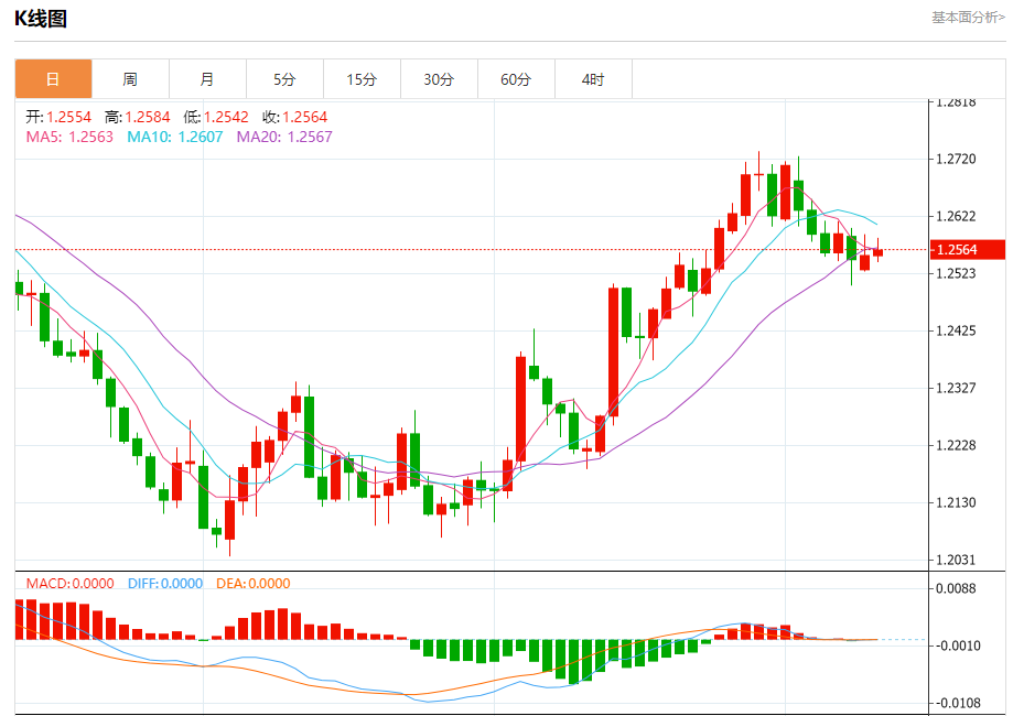 周二盘中,英镑/美元报1.2566,涨幅0.08%。