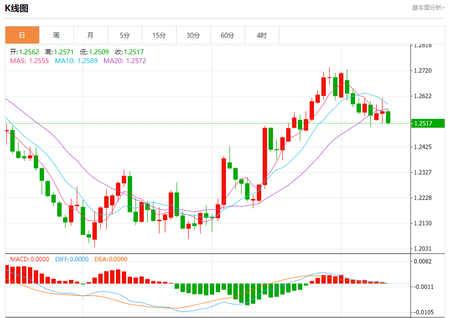 周三盘中,英镑/美元报1.2519,跌幅0.36%。