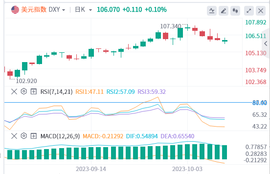 尽管美元受益于飞往安全地带的航班,但美元目前已连续第五次下跌。尽管中东危机仍在持续,但多周的牛市趋势正在受到考验。 芝加哥商品交易所FedWatch的最新数据显示,美国再次加息的可能性正在下降,而就在一周左右之前,今年再次加息的几率接近50/50。美联储最近的评论有一种更温和的感觉,最近美国长期国债收益率的上升是一个促成因素。美联储官员Philip Jefferson本周表示,央行在考虑进一步加息时需要谨慎行事。此外,达拉斯联储主席洛里·洛根(Lorie Logan)在周一的一次演讲中指出,如果长期利率因长期溢价上升而继续上升,“可能就不那么需要提高美联储基金利率了”。有四名美联储官员定于今天发表讲话,他们的言论需要密切关注。 美元指数技术分析 美元指数目前正在逼近20天简单移动平均线,并试图突破9月29日105.67的低点。一个确定的突破将留下105.48和105.35作为下一个支持级别。 ![]() |