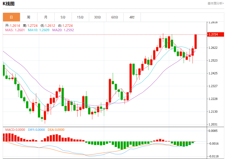 周四盘中,英镑/美元报1.2725,涨幅0.85%。