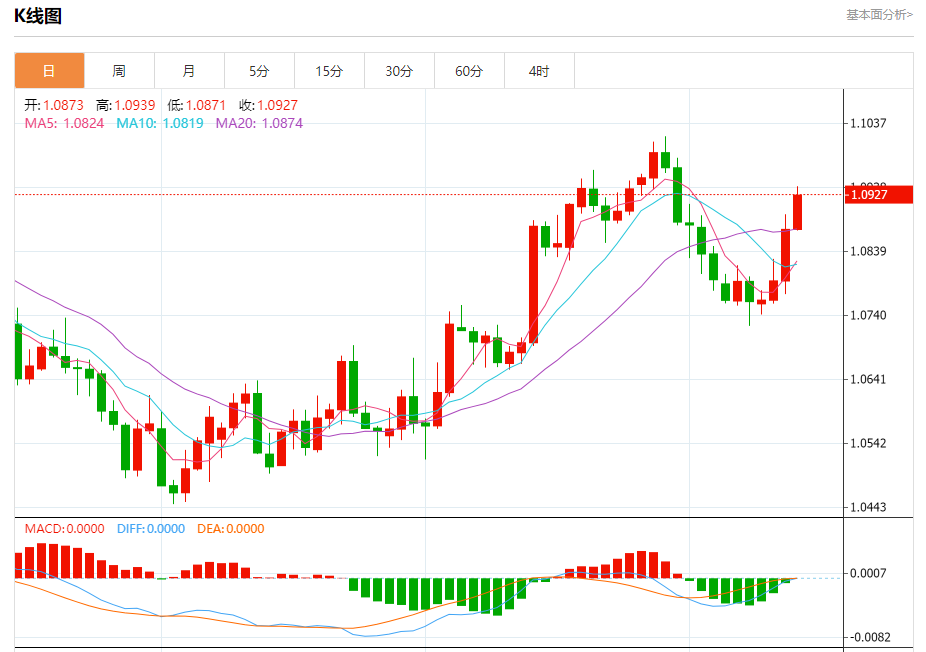 周四盘中,欧元/美元报1.0928,涨幅0.50%。