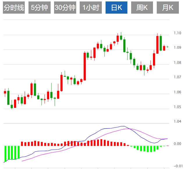 周二欧盘,欧元/美元走高,现报1.0941附近,日内上涨0.16%。 |