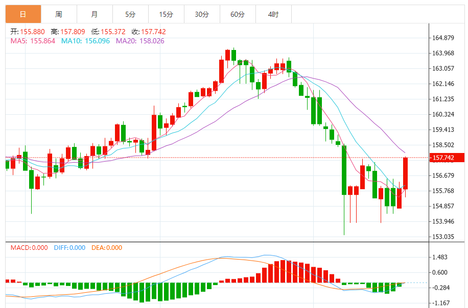 周二,欧元/日元上涨1.18%至157.766附近。