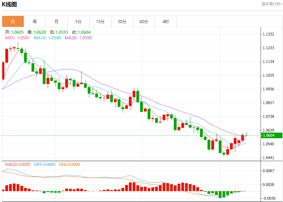 周三盘中,欧元/美元报1.0605,涨幅0.00%。