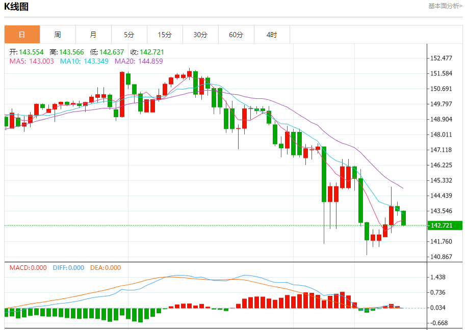 周四盘中,美元/日元报142.732,跌幅0.58%。