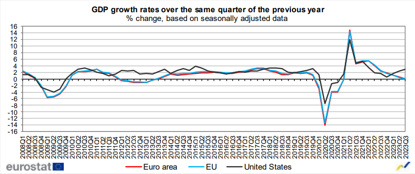如果2023年可以用一个词来形容,那就是“情绪”。在过去的四年里,世界变得不同了,投资者的心态也不同了。随着今年的结束,尽管这条路还很长,但在不久的将来,一些正常的迹象正在显现。 让我们简单回顾一下过去。2020年的疫情在大范围封锁期间中断了全球经济活动。2021年,世界从无精打采中醒来,试图恢复正常,但在这件事上惨败。政府承担了仍然到期的债务,中央银行也措手不及。 为什么?因为暂停所有活动的决定迫使政府出手相救,为企业和家庭提供财政支持。宽松的货币政策和封锁的结束导致价格压力飙升,大多数发达经济体的通货膨胀在2022年年中达到数十年来的峰值。 因此,全球央行大规模加息,这与衰退风险的增加有关。美联储领先,但除了日本银行,所有主要央行都紧随其后。 事实上,通货膨胀在2022年下半年有所回落,市场希望削弱了对避险美元的需求。欧元/美元对在几个月前触底0.9535点后,于2022年收于1.0700点左右。 欧元2023回顾 由于美联储也率先放缓了加息步伐,金融市场变得乐观,并胆怯地考虑货币政策的潜在转变。无论如何,大西洋两岸的政策制定者在2022年底承诺进一步加息,并信守诺言。 美联储在2022年前七次扣动扳机,将基准利率从0.00%-0.25%上调至4.25%-4.50%。随后,美联储在2023年前又上调了四次25个基点,使7月份的利率达到5.25%-5.50%。 欧洲央行(ECB)对主要再融资利率进行了四次上调,在2022年将其从0.0%上调至2.50%。欧洲央行在2023年继续进行了六次加息,使其在9月份达到4.50%。 很明显,欧洲央行对货币紧缩采取了更为保守的做法,除此之外还有充分的理由。作为欧盟一部分的不同经济体之间的不平衡值得进行微妙的调整,因为共同的货币政策需要使繁荣的经济体与长期与赤字和贫困作斗争的经济体相适应。 随着时间的推移,利率持续上升,市场参与者开始怀疑央行能否在避免经济挫折的同时抑制通胀。对大范围经济衰退的担忧促使投资者重返避险货币美元。随着美联储主席杰罗姆·鲍威尔和欧洲央行行长克里斯蒂娜·拉加德一致将控制通胀置于经济增长之上,央行行长们引发了与增长相关的关注。 尽管如此,随着通胀水平的持续回落,人们的希望增加了。到2023年第一季度末,市场参与者开始谈论降息。随着价格压力的进一步缓解,尽管政策制定者对此发出了警告,但赌注还是增加了。 到2023年年中,央行行长们对他们的言论进行了适度调整。通货膨胀仍然是主要的担忧,但他们没有坚持继续加息,而是引入了“长期更高”的概念,将利率保持在足够的限制水平,以实现稳定和目标通胀。 政策制定者可能会在全年掀起轩然大波,12月也没有出现如此渴望的降息。然而,很明显,放松货币政策是下一步行动。 向更保守的方法转变是出于恐惧。通货膨胀继续缓解,但经济增长仍处于不利地位。 根据欧盟统计局发布的最新可用数据,与上一季度相比,第三季度经季节性调整的欧元区国内生产总值下降了0.1%,欧盟保持稳定。2023年第二季度,欧元区GDP增长0.2%,在欧盟保持稳定。 与上年同期相比,2023年第三季度,经季节性调整的欧元区和欧盟GDP均增长了0.1%,此前欧元区增长了0.5%,欧盟增长了0.4%。 |