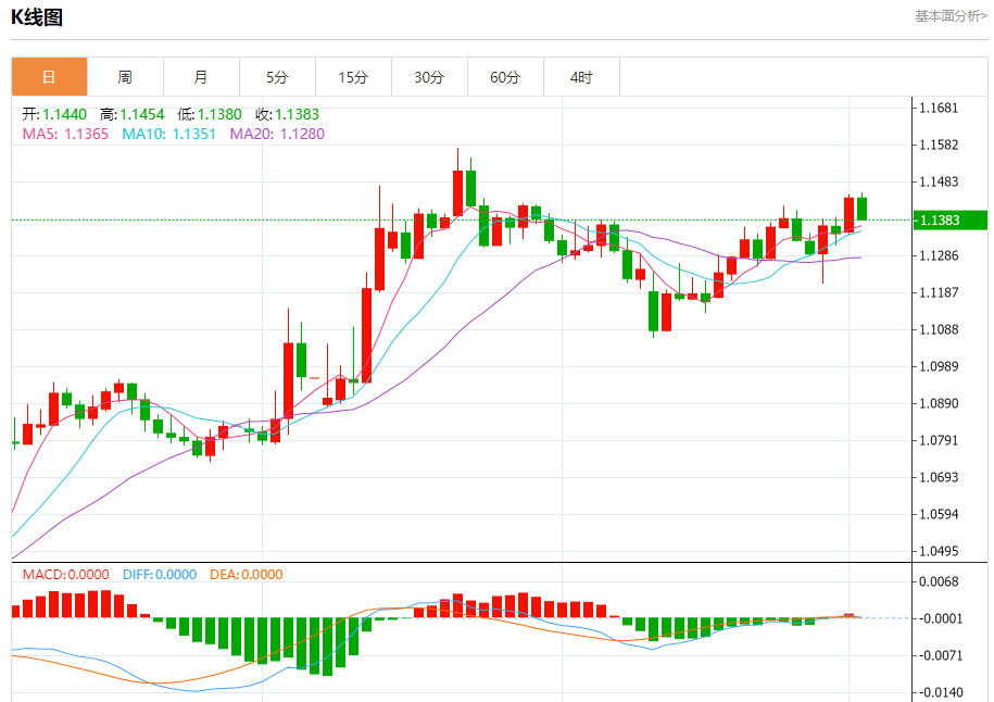 周二盘中,欧元/美元报1.1384,跌幅0.48%。