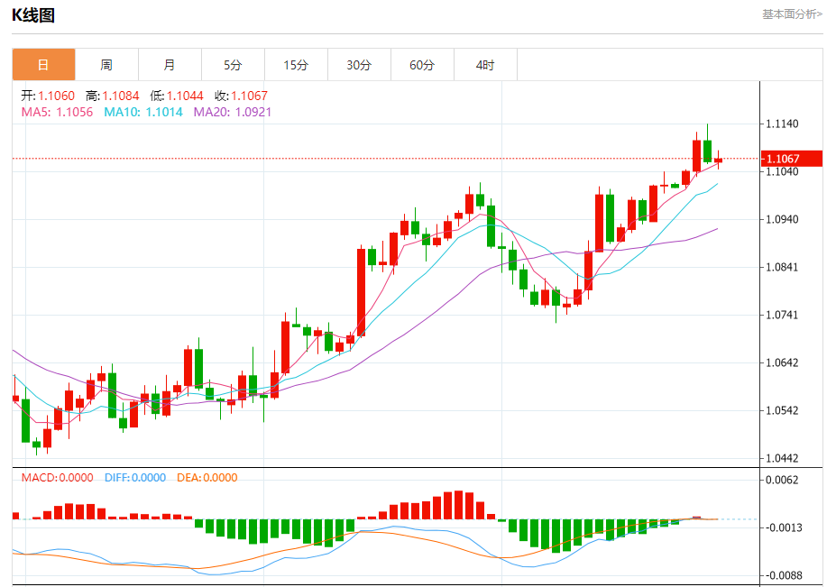 周五盘中,欧元/美元报1.1067,涨幅0.05%。