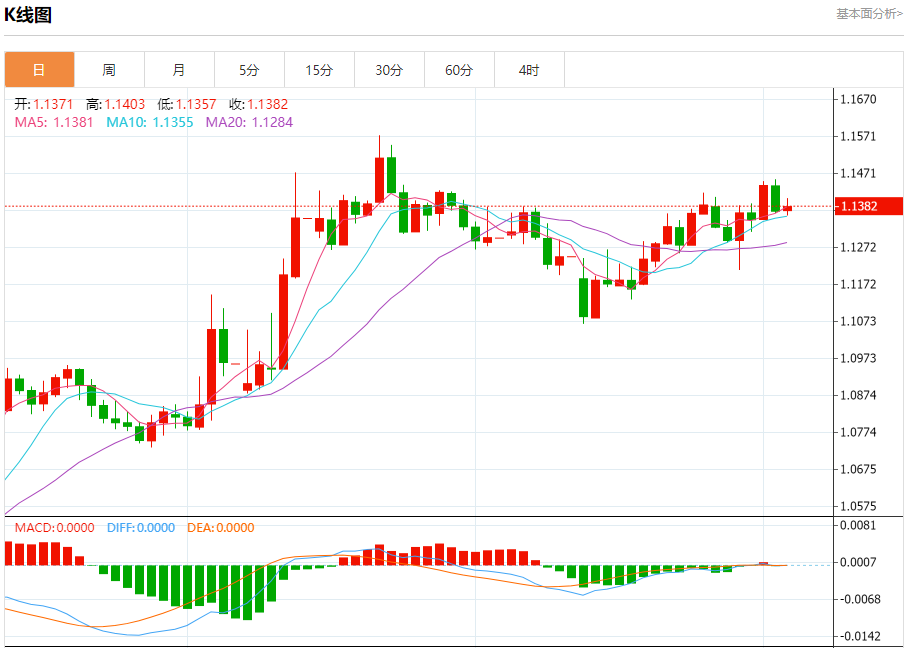 周三盘中,欧元/美元报1.1379,涨幅0.10%。