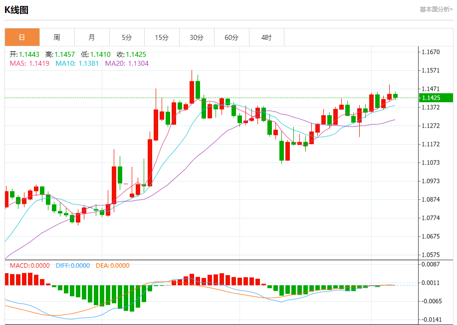 周五盘中,欧元/美元报1.1420,跌幅0.21%。
