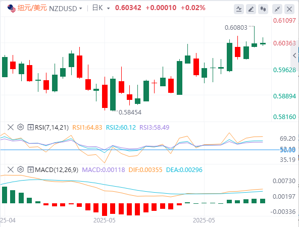 6月6日,周五亚市盘中,纽元/美元交投于0.6034附近,此前从周四触及的八个月高点0.6081回落。随着美元(USD)上涨,货币交叉盘下跌,交易员谨慎等待即将到来的美国非农就业数据,预计5月份将增加130,000个工作岗位,低于4月份的177,000个。此外,预计失业率也将稳定在4.2%。 瑞银经济学家保罗·多诺万(PaulDonovan)表示,美国(US)经济前景的不确定性使美联储(Fed)主席杰罗姆·鲍威尔(JeromePowell)难以决定货币政策。由于鲍威尔坚持对数据的依赖,政策错误的风险增加。政策运行具有滞后性和实时数据,这是不可靠的,通常是一个糟糕的选择。 美国总统唐纳德·特朗普和中国国家主席习近平之间的一次富有成效的通话改善了市场情绪。特朗普表示,这次通话富有成效,并准备继续关税谈判。交易员可能会观察周一来自中国的大量数据,包括消费者、生产者价格和贸易数据。中国经济的任何变化都可能影响新西兰元(NZD),因为中国和新西兰是紧密的贸易伙伴。 市场现在预计新西兰储备银行(RBNZ)在上周降息25个基点后,将在7月的会议上保持利率稳定。预计央行将在8月进行本周期的最后一次降息。 |