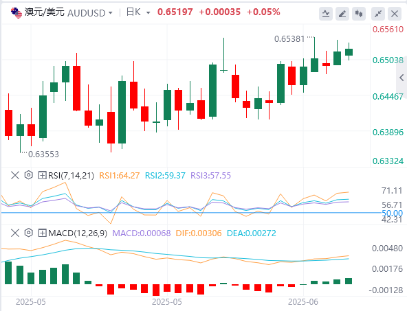6月10日,周二欧市盘中,澳元/美元上涨,连续第二天扩大涨幅。澳元/美元货币对因希望美国(US)与中国的广泛关税紧张局势降温而获得支撑。来自中国的任何经济更新都可能影响澳元,因为中国和澳大利亚是亲密的贸易伙伴。 美中顾问预计将于第二天周二上午10:00在伦敦再次会面。据彭博社报道,随着世界最大的两个经济体寻求缓解技术和稀土元素运输的紧张局势,贸易谈判将继续进行。 澳大利亚西太平洋银行消费者信心指数6月环比上涨0.5%,大幅回落5月份的2.2%。全球贸易的持续不确定性打压了市场情绪。然而,在澳大利亚储备银行(RBA)5月降息和通胀缓解迹象的推动下,这是今年的第四个月增长。 美国劳工统计局(BLS)报告称,美国5月份非农就业人数(NFP)增加了139,000人,而4月份增加了147,000人(从177,000人修正)。这一读数高于市场普遍预期的130,000人。此外,失业率稳定在4.2%,平均时薪保持在3.9%不变,两项数据均强于市场预期。 美国总统唐纳德·特朗普周三在TruthSocial上发表的一篇文章中呼吁美联储(Fed)主席杰罗姆鲍威尔降低政策利率。“ADP数据出来!!”太晚了“鲍威尔现在必须降低利率。他令人难以置信!!欧洲已经降息了九次,”特朗普说。 周三,明尼阿波利斯联储主席尼尔·卡什卡利(NeelKashkari)指出,劳动力市场正显示出一些放缓的迹象。然而,经济持续存在不确定性,美联储必须保持观望模式,以评估经济如何应对不确定性。 众议院共和党人通过了特朗普的“美丽大法案”,这是一项数万亿美元的税收和支出计划,可能会增加美国财政赤字,以及债券收益率在更长时间内保持较高水平的风险。这种情况引发了对美国经济的担忧,并促使交易员在“出售美国”趋势下出售美国资产。政策专家预计参议院将发生变化,因为共和党立法者的目标是在7月4日之前敲定“大法案”。 中国国家统计局报告称,继4月份下降0.1%之后,5月份居民消费价格指数(CPI)以0.1%的年率下降。然而,市场共识是报告期内下降0.2%。与此同时,中国的CPI通胀率环比下降0.2%,而4月份的涨幅为0.1%。中国的生产者价格指数(PPI)继续走弱,继4月份下降2.7%之后,5月份年率下降3.3%。 中国5月份贸易差额(CNY)达到7435.6亿元人民币,高于之前的6899.9亿元人民币顺差。与此同时,出口同比增长6.3%,而4月份为9.3%。同期,中国进口同比下降2.1%,而此前为0.8%。 澳大利亚4月份贸易差额环比顺差5,413M,低于预期的6,100M和前值的6,892M(从6,900M修正)。4月份出口环比下降2.4%,而前值增长7.2%(前值为7.6%)。与此同时,进口增长1.1%,而3月份下降2.4%(前值为-2.2%)。中国财新服务业采购经理人指数(PMI)一如预期般升至5月份的51.1,符合4月份的50.7。 澳元/美元技术分析 澳元/美元周二交投于0.6520附近。日线图的技术分析表明,由于该货币对仍处于上升通道模式内,因此持续看涨。此外,该货币对仍高于9天指数移动平均线(EMA),这表明短期价格势头更强劲。14天相对强弱指数(RSI)也保持在50关口上方,表明看涨偏见。 澳元/美元货币对的目标是6月5日创下的七个月高点0.6538的直接障碍。进一步的上涨可能会促使该货币对探索八个月高点0.6687附近的区域,与0.6690附近的上升通道上边界一致。 不利的一面是,主要支撑位出现在0.6489的9天EMA,与上升通道的下边界0.6480附近一致。跌破这个关键支撑区域可能会削弱看涨偏见,并导致澳元/美元货币对测试50天EMA0.6412。 |