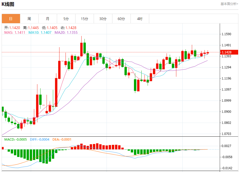 周三盘中,欧元/美元报1.1433,涨幅0.09%。