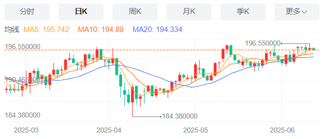 周四,英镑/日元下跌0.17%至195.48附近。