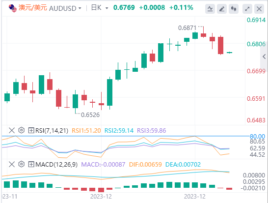 1月3日,周三亚市早盘,澳元/美元徘徊在0.6769附近。 周二澳元/美元下跌,当日下跌0.8%,拉开了2024年第一个正式交易日的序幕,美元总体看涨,不过由于中国12月财新制造业采购经理人指数(PMI)好于预期,澳元/美元遇阻。 市场对美联储(Fed)降息的夸张押注开始缓解,因为投资者将2024年内美联储降息预期下调至150个基点,而美国经济数据的蹒跚起步也在打压投资者情绪,因为市场正在为周五将公布的今年首次非农就业数据(NFP)做准备。 美国12月制造业采购经理人指数降至4个月低水平47.9,期值48.2。 市场正在为周五的美国12月非农做准备,预计该数据将从19.9万下降至16.8万,但在此之前,周四将公布中国财新服务业采购经理人指数(上一次为51.5),以及美国ADP就业人数变化,预计该数据将从10.3万小幅上升至11.5万。 周三的美国数据也将备受关注,预计12月ISM制造业采购经理人指数将从46.7升至47.1,此外还有最新的美联储会议纪要,投资者将仔细分析,试图从中了解美联储决策者在多大程度上倾向于开始下一轮降息周期。 澳元/美元技术水平 周二澳元/美元维持跌势,跌破了200小时简单移动均线(SMA),这是澳元/美元自12月中旬强劲上扬以来首次跌破该均线,澳元/美元跌至两周低点0.6750附近。 澳元/美元从上周高点0.6870下跌愈1.5%,技术指标陷入超买区域,澳元/美元可能会继续回落,不过0.6600关口下方将构筑技术底部,原因50日均线穿越长期200日均线,构筑金叉信号。 |
