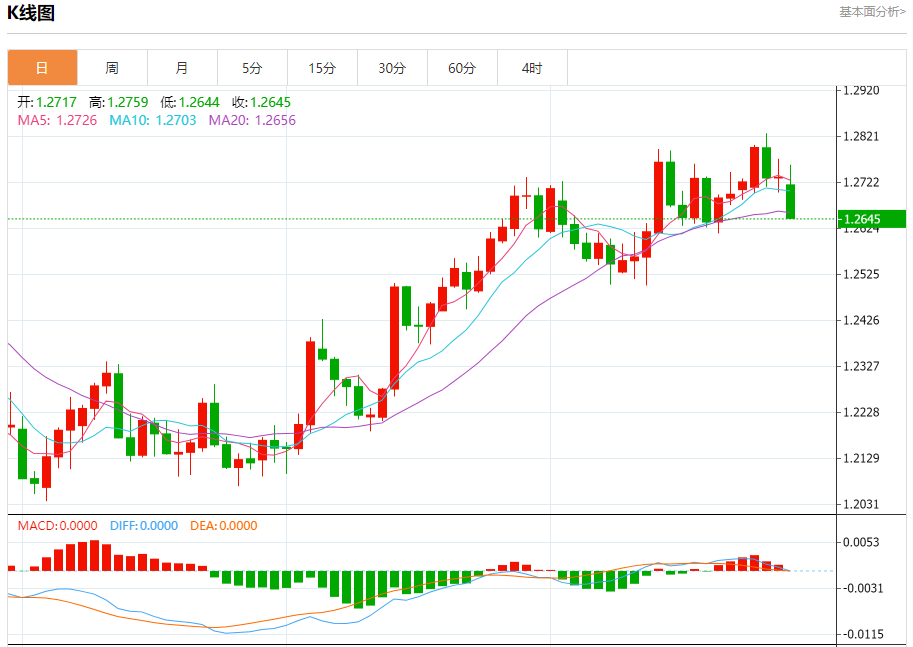 周二盘中,英镑/美元报1.2648,跌幅0.68%。