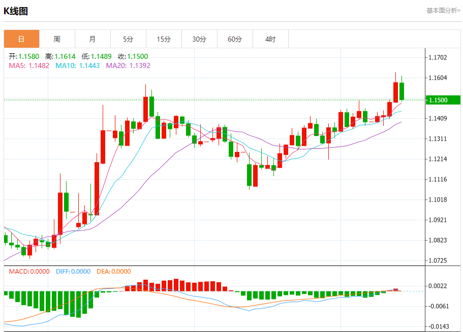 周五盘中,欧元/美元报1.1505,跌幅0.66%。