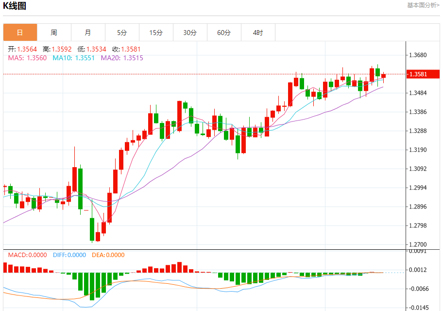 技术点评:RSI技术指标大于中性区域50。 MACD技术指标处在其信号线之下看多。 价格可能会回撤。 此外,价位高于其20天及50天移动平均线 ( 分别位于1.3563 和1.3566 )。