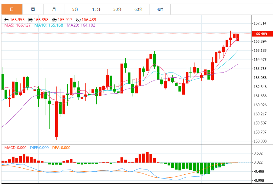 周一,欧元/日元上涨0.02%至166.520附近。