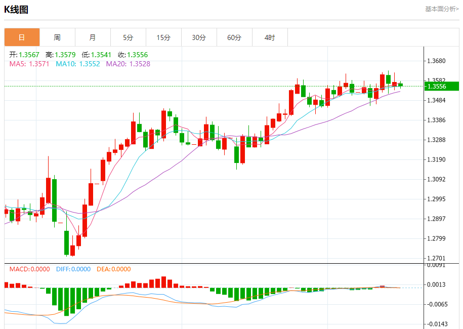 日线图显示汇价处于下行通道中,若无法站稳1.3570,可能延续跌势。
