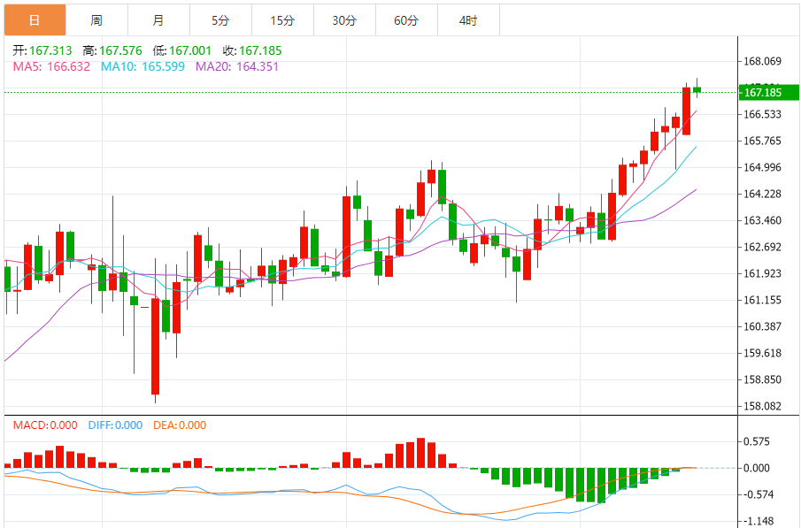 周二,欧元/日元下跌0.07%至167.228附近。