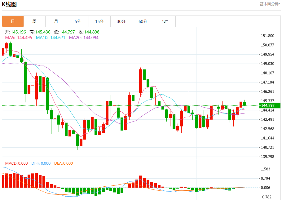 美元兑日元今日开盘于145.2120,盘中最高触及145.4400,最低下探145.1480。昨日受美国国债收益率上升和日本贸易逆差扩大影响,美元兑日元上涨0.37%,但今日因市场避险情绪升温,日元小幅反弹。技术面显示,美元兑日元日线级别在145.00-145.50区间震荡,下方受20日均线支撑,上方则面临145.60的阻力位。