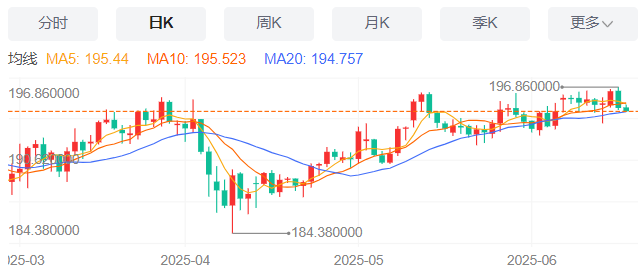 周三,英镑/日元下跌0.14%至194.80附近。