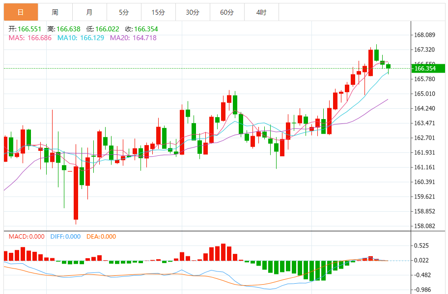 周四,欧元/日元下跌0.14%至166.373附近。