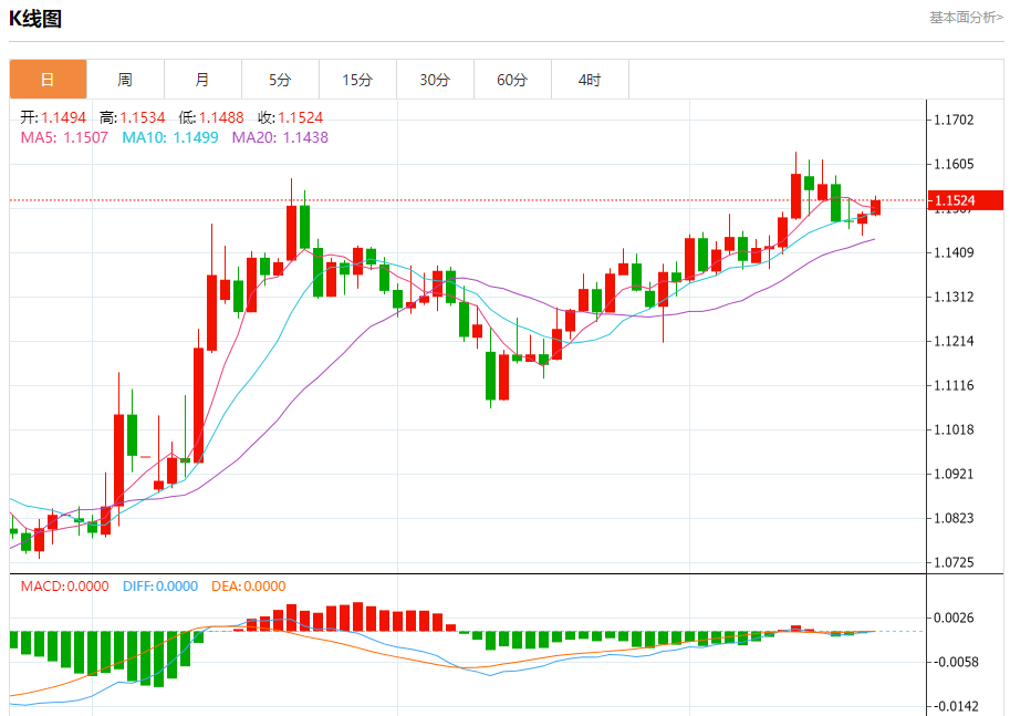 周五盘中,欧元/美元报1.1523,涨幅0.25%。