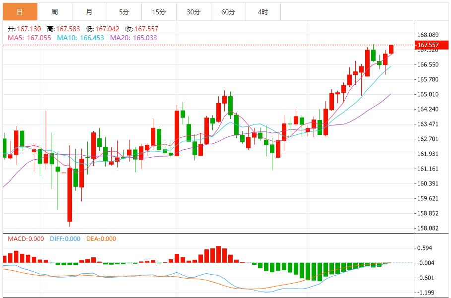 周五,欧元/日元上涨0.27%至167.591附近。