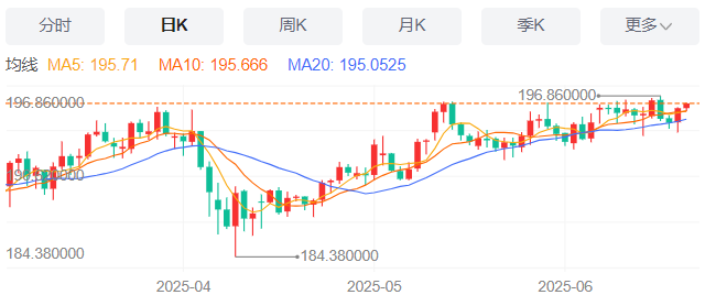 周五,英镑/日元上涨0.19%至196.28附近。
